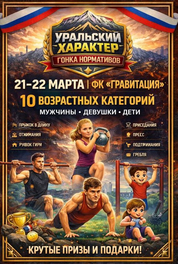 21 и 22 марта в ФК «Гравитация» пройдет «Уральский характер – гонка нормативов» среди мужчин, женщин и детей в 10-ти возрастных категориях. Это будет серьезная проверка силы, выносливости и характера. Формат этого фитнесс-батла – все упражнения (прыжок в длину, отжимания, рывок гири, приседания, упражнения на пресс, подтягивания, гребля) выполняются подряд, победители определяются по времени и показанному результату.